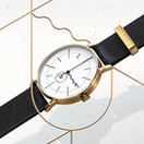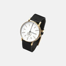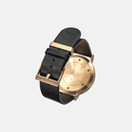 Корпус выполнен из нержавеющей стали с золотым PVD-покрытием, что придаёт часам элегантный и сдержанно-премиальный вид. Минеральное стекло с сапфировым покрытием защищает циферблат от повседневных царапин, а кожаный ремешок чёрного цвета подчёркивает контраст и утончённость дизайна.